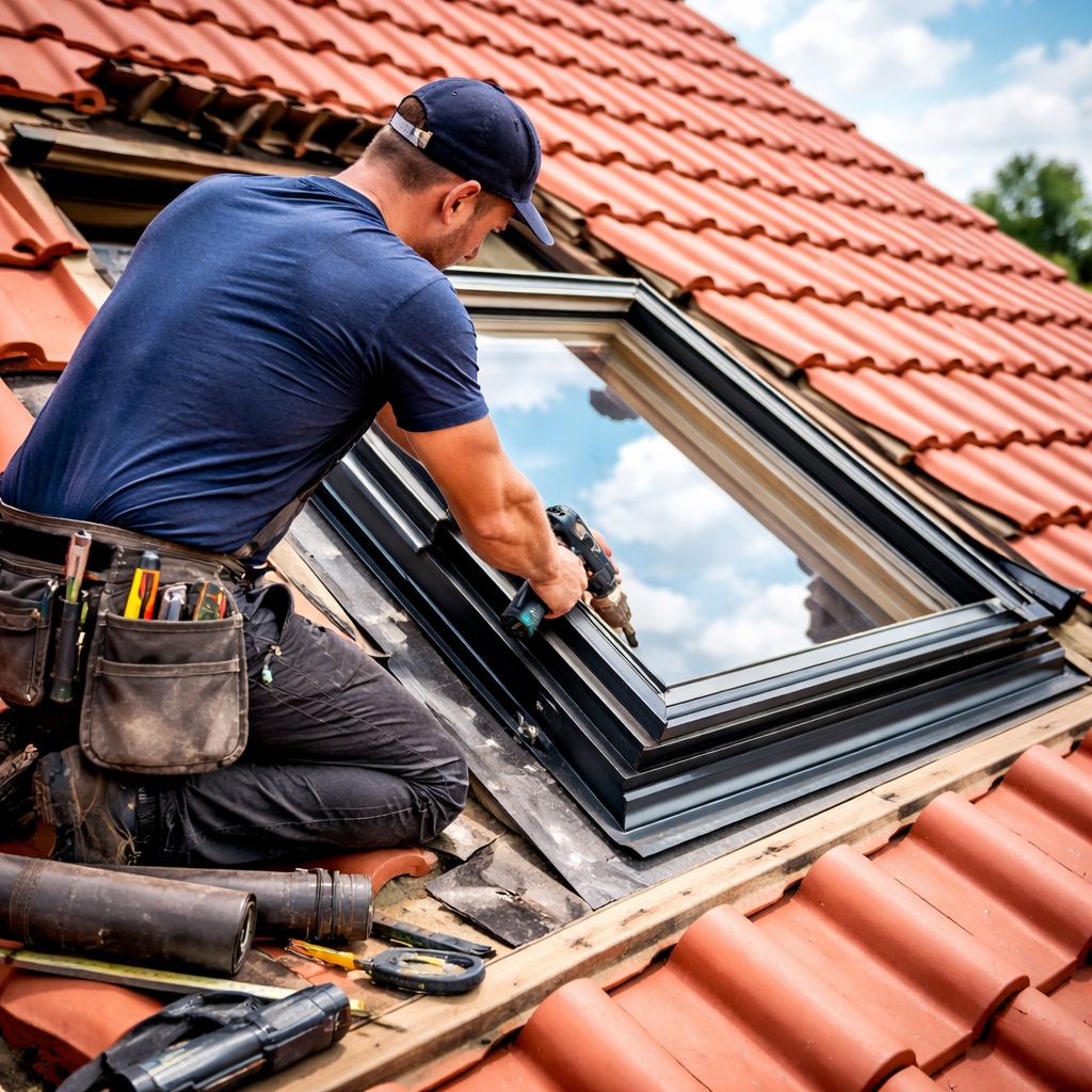 Montaż okien dachowych, obróbka komina, montaż komunikacji dachowej.